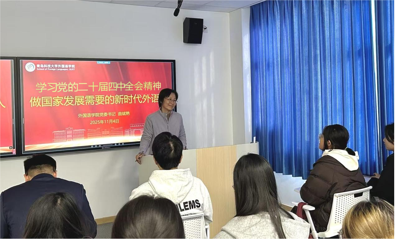 根据《中共世俱杯买球入口委员会学习宣传贯彻党的二十届四中全会精神工作方案(草案)》,为在世俱杯买球入口迅速掀起学习宣传贯彻党的二十届四中全会精神热潮,11月4日,世俱杯买球入口党委书记曲斌艳以《学习党的二十届四中全会精神,做国家发展需要的新时代外语人》为题,为联系班级讲授专题思政课。