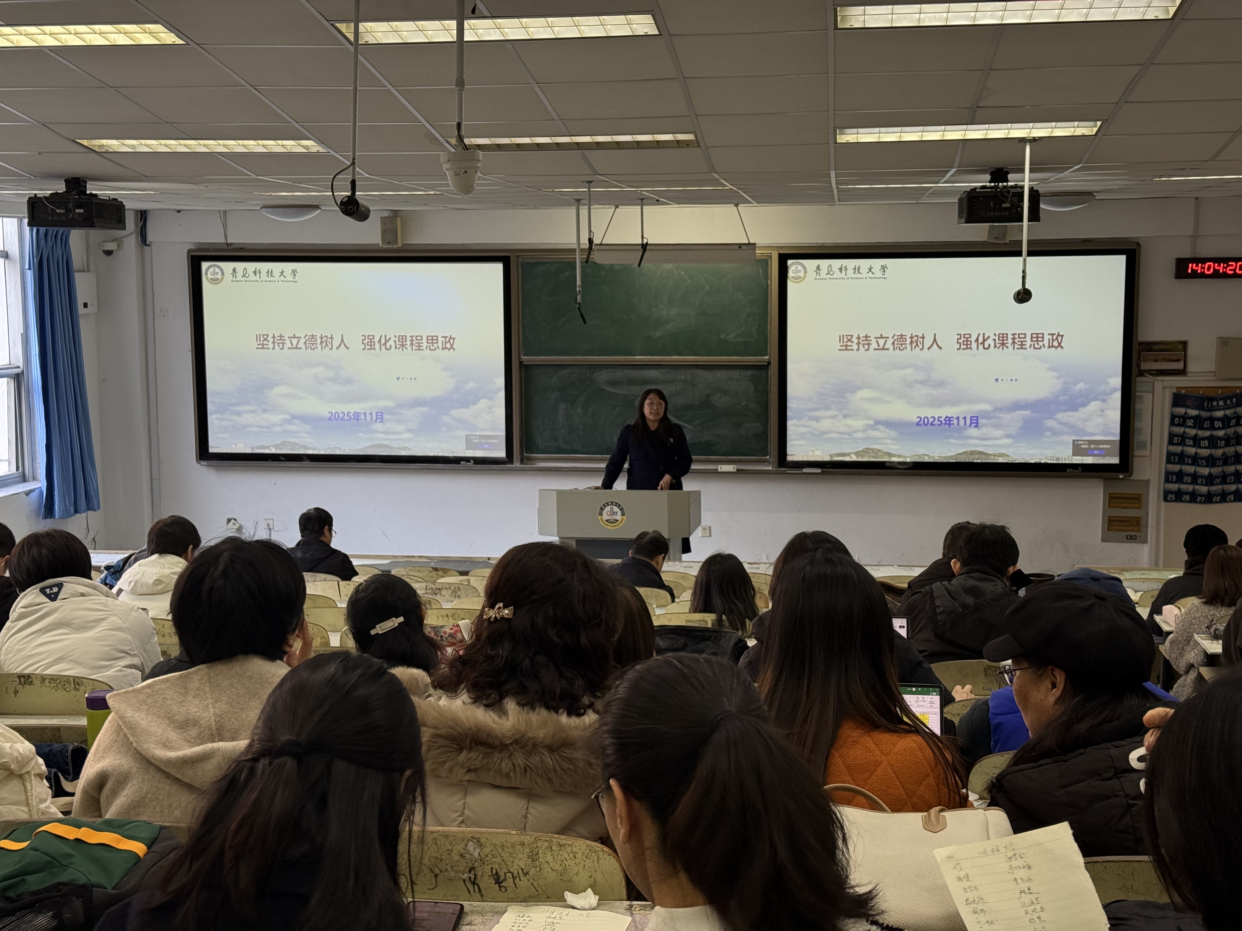随后,高媛媛老师以其扎实的理论功底和丰富的教学案例,为与会教师带来了一场内容丰富、启发性强的精彩讲座。高老师首先从国家战略和高等教育根本任务的高度,深入剖析了“课程思政”的核心要义与时代价值,指出其是构建“三全育人”大格局的关键一环。紧接着,她结合外语学科的特点,分析了数字化背景下外语课程思政的理论框架和实践路径,重点阐述了外语类课程如何“如盐化水”,融入家国情怀、文化自信、职业道德、科学精神和人文素养等思政元素。她指出,教师要善于挖掘教材中的隐性思政资源,引导学生批判性思考中西方文化差异,在提升语言能力的同时,坚定学生的文化认同与制度自信,增强用外语讲好中国故事的能力。
