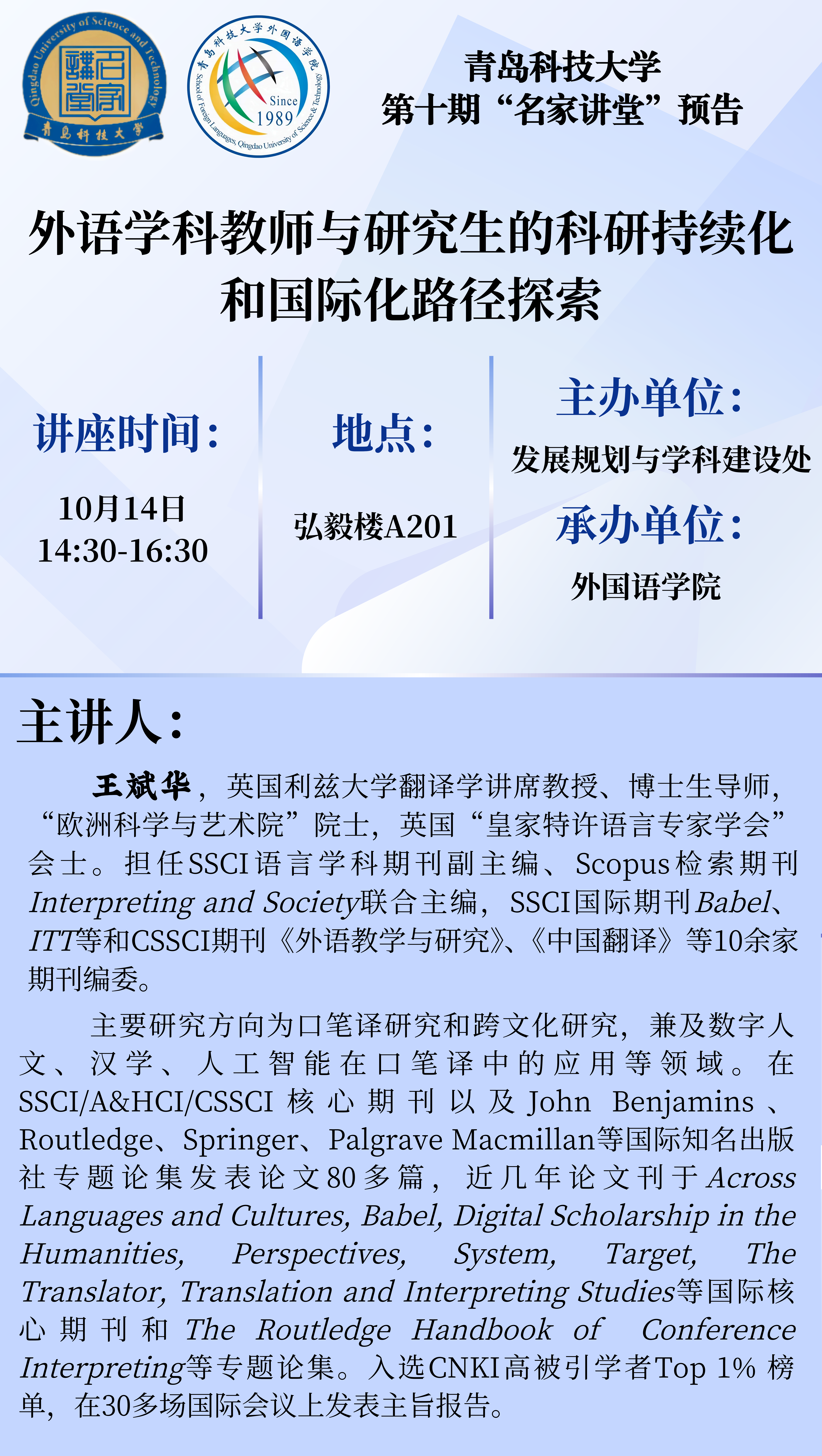 讲座题目:外语学科教师与研究生的科研持续化和国际化路径探索