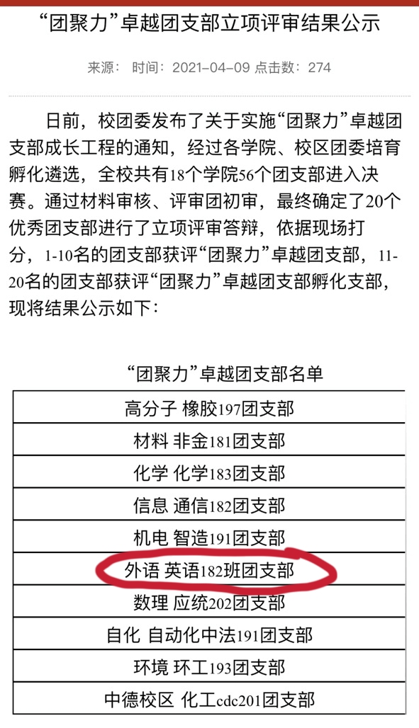 英语182团支部一直以做好青年政治引领工作为首要任务,植根团建团务基础,突出团支部政治引领作用,针对支部内青年学生在成长发展的过程中所面临的思想困惑,开展各类特色理想信念教育活动,团支部集体学习十九届五中全会精神,共青团十八届五中全会精神,开展“学党史 学四史 致敬1921“活动等,提升团支部各成员的思想水平。根据团支部实际情况,常态化开展课程答疑、专业研讨、团员结对帮扶、实践科技创新等主题团日活动,以团建促学习,以学习促发展,充分发挥专业特色优势,将政治理论学习与英语专业学习相结合,用双语探讨时政热点问题,切实提升青年学生的学业成绩、专业能力和创新品质。结合青年学生对强身健体以及体育活动的需要,建立专门跑步打卡群,切实提高团员青年身体素质,增强支部成员凝聚力。根据支部内青年学生实际需要,开展分享优秀英文影音及文学、诗歌作品活动,交流学习,提升人文素养。团支部依托各类特色社会实践、公益服务、实习实践等活动,教育引导青年脚踏实地,吃苦耐劳,开拓奋进,支部成员积极参加校庆志愿服务,“名校进名企”实习,参与各项体育竞赛志愿服务。规范开展团员发展、团员管理、团员教育、团费收缴等工作,做好推优入党工作。英语182团支部一直坚持德智体美劳五育并举,教育引导本支部青年自觉把报国之志转化为实际行动,努力成长为德智体美劳全面发展的时代新人。